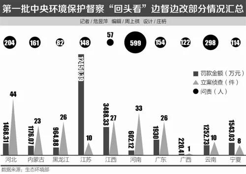 截至6月25日晚八時,6個督察組共收到群眾舉報29245件,受理有效舉報24246件,經(jīng)梳理合并重復(fù)舉報,累計向被督察地方轉(zhuǎn)辦交辦23087件。從數(shù)量上看,河南、河北的交辦數(shù)量最多,都超過了3000件。各被督察地方完成查處12409件,其中立案處罰2579家,罰款25096萬元;立案偵查208件,拘留235人;約談1065人,問責(zé)1939人。