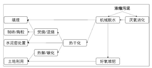 為了解決上述問(wèn)題,應(yīng)該采用逆向設(shè)計(jì)代替?zhèn)鹘y(tǒng)的正向設(shè)計(jì),從污泥的最終出路出發(fā)對(duì)全流程進(jìn)行布置。嚴(yán)格來(lái)說(shuō),污泥的處置方式只有填埋、土地利用和建材化等。污泥填埋可以消納全部污泥,是現(xiàn)階段許多城市不得不采用的處置方式。然而,從填埋場(chǎng)運(yùn)行管理以及政策導(dǎo)向看,盡量減少進(jìn)入填埋場(chǎng)的水分和有機(jī)質(zhì)是污泥填埋的主要趨勢(shì)。