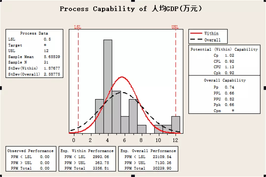 通過對(duì)全國各大省市人均GDP直方圖及正態(tài)分布圖進(jìn)行分析,人均GDP的分布也服從正態(tài)分布,大部分省市的年人均GDP位于4-7萬元區(qū)間,全國省市人均GDP均值為5.66萬元。