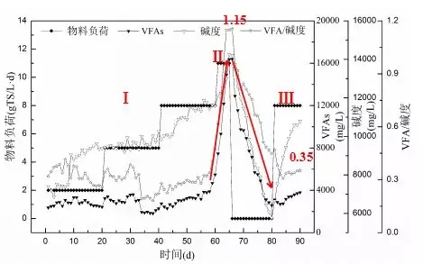 對(duì)于反應(yīng)器運(yùn)行過程中堿度和有機(jī)酸濃度的變化,VFA/堿度基本在0.4以內(nèi),表明反應(yīng)器運(yùn)行較為穩(wěn)定,VFAs、堿度和VFA/堿度均急劇上升。