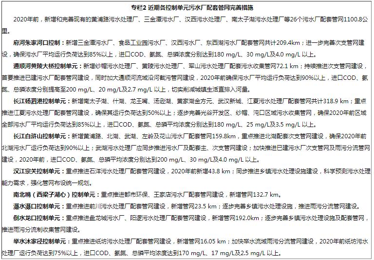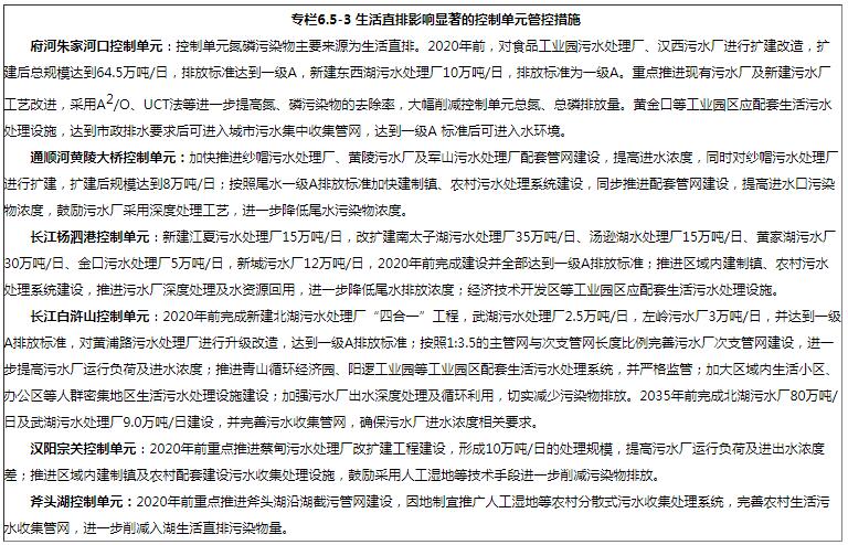 加快城鎮(zhèn)污水處理設(shè)施提標(biāo)改造。梁子湖、斧頭湖等敏感區(qū)域內(nèi)的現(xiàn)有城鎮(zhèn)污水處理設(shè)施2016年底前達(dá)到一級(jí)A排放標(biāo)準(zhǔn);新建城鎮(zhèn)污水處理設(shè)施執(zhí)行一級(jí)A排放標(biāo)準(zhǔn),現(xiàn)有處理設(shè)施需強(qiáng)化脫氮除磷工藝,逐步達(dá)到一級(jí)A排放標(biāo)準(zhǔn)。2020年前,灄水灄口控制單元、倒水龍口控制單元、舉水沐家徑控制單元、長(zhǎng)江白滸山控制單元、長(zhǎng)江楊泗港控制單元等重點(diǎn)區(qū)域內(nèi)污水廠應(yīng)完成提標(biāo)改造,出水達(dá)到一級(jí)A排放標(biāo)準(zhǔn);2035年前,研究基于水環(huán)境質(zhì)量目標(biāo)的城鎮(zhèn)生活污水廠出水排放指標(biāo)及要求,完成全市城鎮(zhèn)污水處理廠達(dá)標(biāo)改造工程。