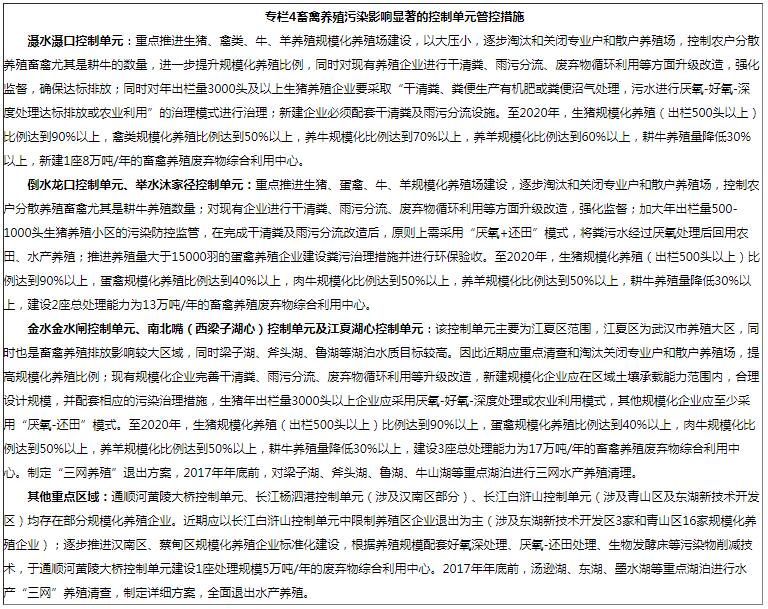 優(yōu)化畜禽及水產(chǎn)養(yǎng)殖布局。2017年前,依法關(guān)閉或搬遷禁養(yǎng)區(qū)內(nèi)的畜禽養(yǎng)殖場(chǎng)(小區(qū))和養(yǎng)殖專(zhuān)業(yè)戶,對(duì)四環(huán)線公路以外的未達(dá)標(biāo)小型養(yǎng)殖小區(qū)按照規(guī)模標(biāo)準(zhǔn)實(shí)施改造升級(jí),不再擴(kuò)大限制發(fā)展區(qū)養(yǎng)殖規(guī)模,同時(shí)做好糞污資源化利用和處理。2018年底前,限制養(yǎng)殖區(qū)規(guī)模以下養(yǎng)殖場(chǎng)全部退出,規(guī)模以上畜禽養(yǎng)殖場(chǎng)(小區(qū))須實(shí)現(xiàn)糞污資源化利用,達(dá)到環(huán)保要求;未達(dá)到環(huán)保要求的,依法責(zé)令停止生產(chǎn)或者使用,并處以罰款。鼓勵(lì)適宜養(yǎng)殖區(qū)內(nèi)散養(yǎng)戶逐步退出,支持發(fā)展高標(biāo)準(zhǔn)、現(xiàn)代化的畜禽養(yǎng)殖場(chǎng)(小區(qū)),實(shí)現(xiàn)畜禽養(yǎng)殖退養(yǎng)平衡。逐步退出水產(chǎn)“三網(wǎng)”養(yǎng)殖。2017年1月底前,拆除梁子湖、湯遜湖、東湖、斧頭湖等重點(diǎn)湖泊的漁業(yè)“三網(wǎng)”設(shè)施;2017年12月底前,完成全市湖泊保護(hù)目錄中湖泊的漁業(yè)“三網(wǎng)”設(shè)施拆除。開(kāi)展?jié)O業(yè)禁養(yǎng)區(qū)劃分,優(yōu)化水產(chǎn)養(yǎng)殖空間布局。中心城區(qū)40個(gè)湖泊列入漁業(yè)禁止養(yǎng)殖區(qū),不得開(kāi)展經(jīng)營(yíng)性水產(chǎn)養(yǎng)殖;其他126個(gè)湖泊由各轄區(qū)人民政府確定禁、限養(yǎng)殖分類(lèi),原則上列入漁業(yè)限制養(yǎng)殖區(qū),對(duì)列入限制養(yǎng)殖區(qū)的由各區(qū)人民政府依據(jù)湖泊水質(zhì)狀況制定養(yǎng)殖水域、面積、種類(lèi)、密度等養(yǎng)殖規(guī)范,實(shí)行不投肥、不投藥、不投飼的生態(tài)養(yǎng)殖模式。到2020年,禁養(yǎng)區(qū)內(nèi)全部畜禽養(yǎng)殖及水產(chǎn)養(yǎng)殖企業(yè)退出;限養(yǎng)區(qū)內(nèi)規(guī)模以下畜禽養(yǎng)殖企業(yè)退出,完成水產(chǎn)禁、限養(yǎng)殖區(qū)域劃分,退出全部湖庫(kù)禁養(yǎng)區(qū)內(nèi)水產(chǎn)養(yǎng)殖,其他區(qū)域內(nèi)實(shí)施水產(chǎn)生態(tài)養(yǎng)殖改造。