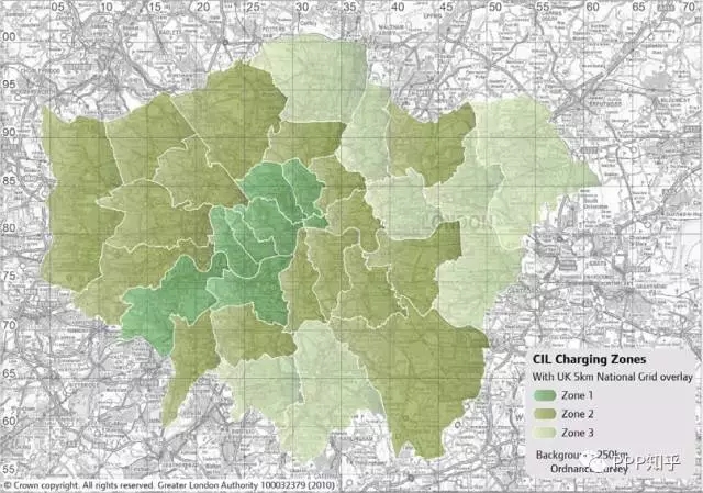 另一方面,對(duì)新建的房地產(chǎn)項(xiàng)目征收社區(qū)基建費(fèi)(CIL-Community Infrastructure Levy),涉及的社區(qū)基礎(chǔ)設(shè)施費(fèi)征收范圍如下圖所示,分為3檔稅率,分別為£50/平方米、£35/平方米、£20/平方米。