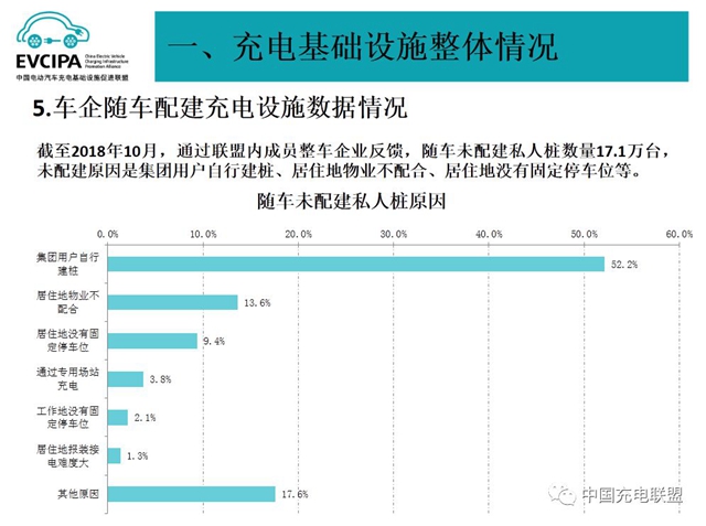 截至2018年10月,通過(guò)聯(lián)盟內(nèi)成員整車(chē)企業(yè)反饋,隨車(chē)未配建私人樁數(shù)量17.1萬(wàn)臺(tái),未配建原因是集團(tuán)用戶(hù)自行建樁、居住地物業(yè)不配合、居住地沒(méi)有固定停車(chē)位等。