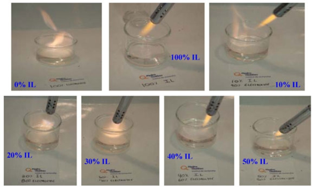 向常用于鋰離子電池電解質(zhì)的有機(jī)溶劑中添加40%的離子液體后,溶劑就變得不再易燃,從而大大提高了鋰離子電池的安全性。(圖片來源:A. Guerfi et al. Journal of Power Sources, 2010)