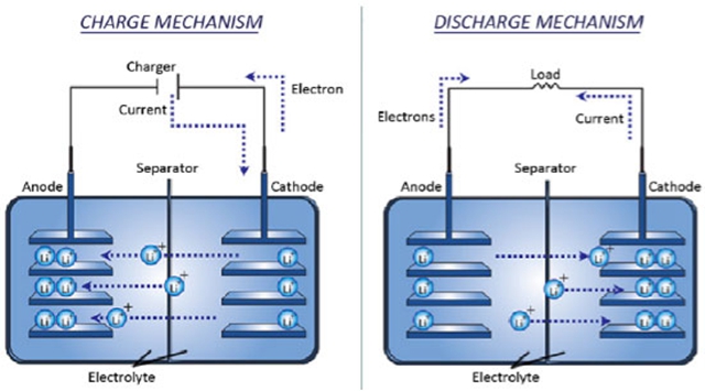 注:Charge mechanism -充電機(jī)理;discharge mechanism -放電機(jī)理;charger -充電器;load -負(fù)載;electrons -電子;current -電流;electrolyte -電解質(zhì);anode -陽極(電池放電時(shí)為負(fù)極);cathode -陰極(電池放電時(shí)為正極);separator -隔膜