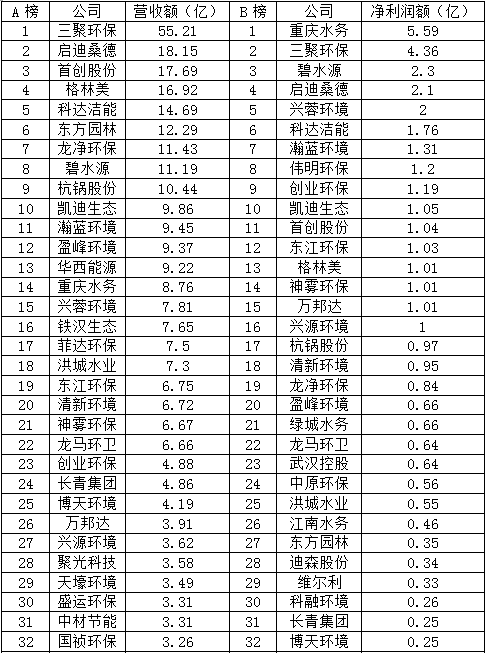 2017年多數(shù)環(huán)保上市企業(yè)一季度報告顯示贏得開門紅,同期均有所增長,僅四家表示營業(yè)收入同期下降。不過凈利潤7家為虧損狀態(tài), 15家同期下降。以下A榜為營業(yè)收入排行榜,B榜為凈利潤排行榜。C榜為營業(yè)收入同比增長率排行榜,D榜為凈利潤同比增長率排行榜。