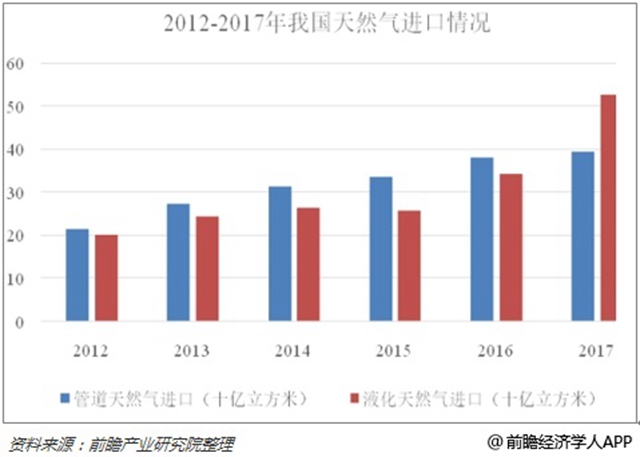 受國內(nèi)天然氣需求拉動我國天然氣進(jìn)口量高速增長。進(jìn)口天然氣又分為進(jìn)口管道氣以及進(jìn)口LNG。2017年我國管道天然氣進(jìn)口量為394億立方米,進(jìn)口量同比增長3.68%;液化天然氣進(jìn)口量為526億立方米,同比增長 53.35%。
