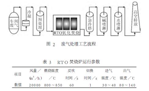 本文研究的RTO氧化焚燒裝置處理風(fēng)量設(shè)計為20000m3/h,處理工藝流程如圖2所示。廢氣經(jīng)過車間二級冷凝回收部分有機溶劑,再進入預(yù)處理堿噴淋,吸收無機廢氣和水溶性廢氣,進入RTO進行氧化焚燒,先進入急冷塔冷卻,最終通過堿、水處理后于15m高空排放。RTO焚燒爐運行參數(shù)見表3