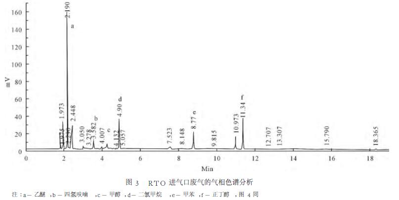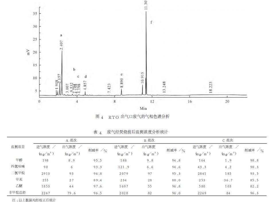 以正丁醇作內(nèi)標(biāo)物,檢測廢氣中乙醚、四氫呋喃、甲醇、二氯甲烷、甲苯共5種組分含量,通過標(biāo)準(zhǔn)樣品分析,確定各個組分停留時間,結(jié)果見圖3和圖4。由圖可見,對各組分出峰面積進行校正,甲醇進氣濃度188mg/m3,經(jīng)RTO氧化焚燒后,甲醇出氣濃度降至9.8mg/m3,削減率94.8%;四氫呋喃進氣濃度121.9mg/m3,經(jīng)氧化焚燒后,出氣濃度降至6.6mg/m3,削減率94.6%;二氯甲烷進氣濃度2079mg/m3,經(jīng)氧化焚燒后,出氣濃度降至97mg/m3,削減率95.3%;同樣,甲苯和乙醚削減率分別達(dá)88.0%和96.8%,且排放濃度滿足《大氣污染物綜合排放標(biāo)準(zhǔn)》(GB16297-2012)。