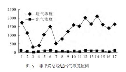 為考察RTO運行性能穩(wěn)定性,運行持續(xù)對該設(shè)備跟蹤研究半個多月,并將RTO進出口非甲烷總烴監(jiān)測濃度進行匯總,研究發(fā)現(xiàn)RTO對總有機廢氣的削減效率達(dá)95%以上,具體見圖5。