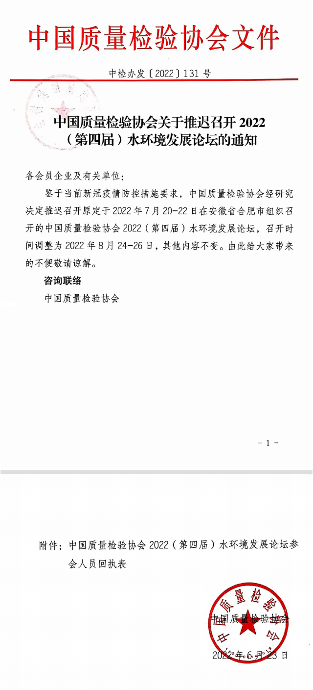 中國(guó)質(zhì)量檢驗(yàn)協(xié)會(huì)關(guān)于推遲召開2022(第四屆)水環(huán)境發(fā)展論壇的通知各會(huì)員企業(yè)及有關(guān)單位: 鑒于當(dāng)前疫情防控措施要求,中國(guó)質(zhì)量檢驗(yàn)協(xié)會(huì)經(jīng)研究決定推遲召開原定于2022年7月20-22日在安徽省合肥市組織召開的中國(guó)質(zhì)量檢驗(yàn)協(xié)會(huì)2022(第四屆)水環(huán)境發(fā)展論壇,召開時(shí)間調(diào)整為2022年8月24-26日,其...