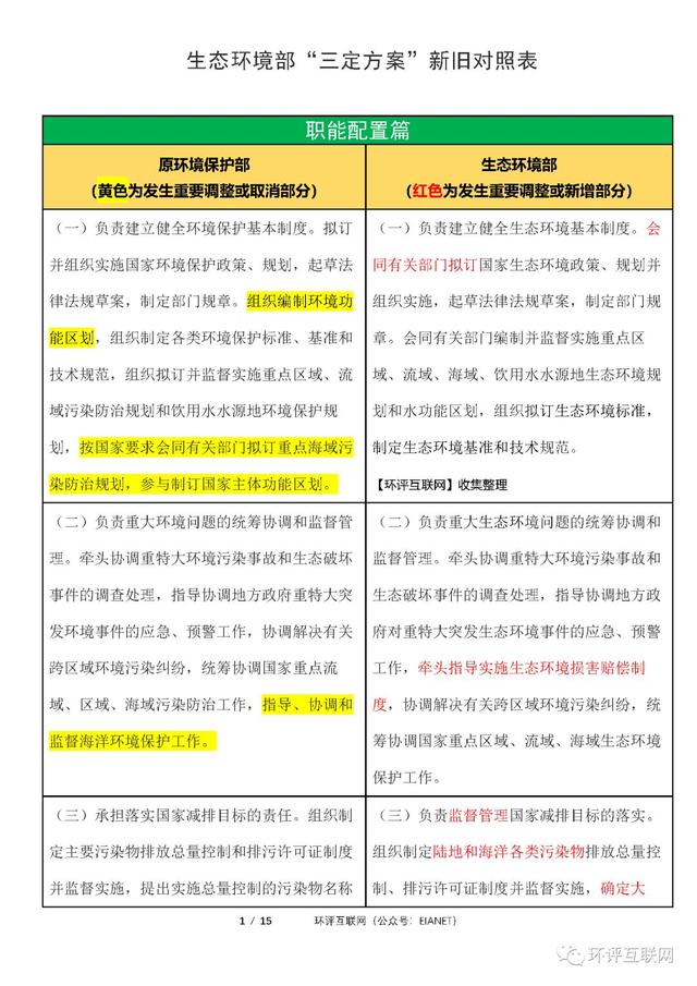 近日,生態(tài)環(huán)境部“三定方案”已經(jīng)印發(fā),在重新整合了部門的職責之外,還增設了新的職能及崗位。為方便大家更好地理解生態(tài)環(huán)境部前后職能配置、內設機構和人員編制的變化,小編特此制作新舊“三定方案”對照表,以供參考。 特別說明:生態(tài)環(huán)境部“三定方案&...