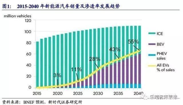 新能源汽車發(fā)展空間巨大,隨著新能源汽車性能提升以及痛點的改善,新能源汽車帶來的沖擊越來越大,滲透率隨之提升。 根據(jù)BNEF預(yù)測,到2025年全球新能源汽車的銷量將達到1100萬輛,滲透率達到11%,同年燃油汽車銷量將達到拐點,步入下行趨勢;到2030年全球銷量將繼續(xù)攀升至3000萬輛,滲透率達到28...