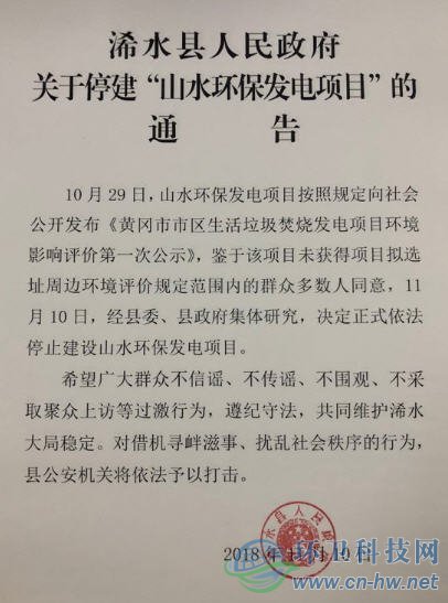 環(huán)衛(wèi)科技網訊,浠水縣人民政府網站10日發(fā)布《關于停建“山水環(huán)保發(fā)電項目”的通告》,通告稱,由于《黃岡市市區(qū)生活垃圾焚燒發(fā)電項目環(huán)評第一次公示》發(fā)布后,該項目沒有得到當地群眾多數人的同意,依法予以停建。 項目環(huán)評公示顯示,黃岡市市區(qū)生活垃圾焚燒發(fā)電項目選址于浠水縣巴河鎮(zhèn)金星村、...