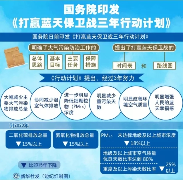 經(jīng)李克強總理簽批,國務(wù)院日前印發(fā)《打贏藍(lán)天保衛(wèi)戰(zhàn)三年行動計劃》(以下簡稱《行動計劃》),明確了大氣污染防治工作的總體思路、基本目標(biāo)、主要任務(wù)和保障措施,提出了打贏藍(lán)天保衛(wèi)戰(zhàn)的時間表和路線圖。來源:新華社、中國政府網(wǎng)圖表:國務(wù)院印發(fā)《打贏藍(lán)天保衛(wèi)戰(zhàn)三年行動計劃》新華社發(fā) 邊紀(jì)紅 制圖《行動計劃》指出,...