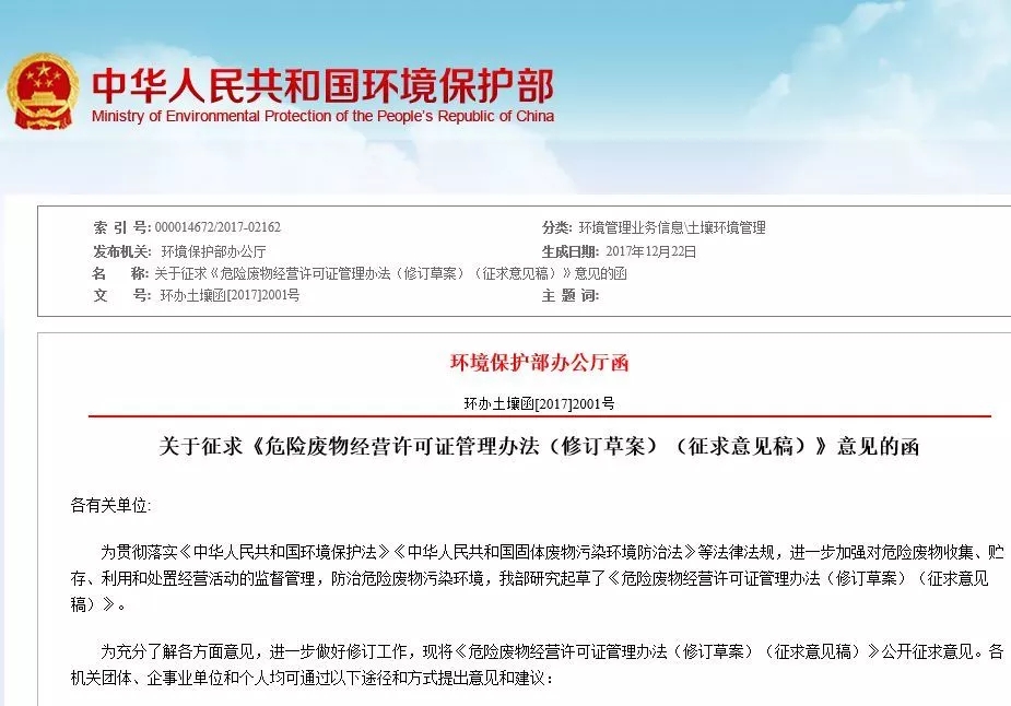 環(huán)境保護(hù)部公布的“關(guān)于征求《危險(xiǎn)廢物經(jīng)營許可證管理辦法(修訂草案)(征求意見稿)》意見的函(環(huán)辦土壤函[2017]2001號(hào)),其中,第三十九條 以下危險(xiǎn)廢物利用或者處置活動(dòng)免于領(lǐng)取危險(xiǎn)廢物經(jīng)營許可證:(一)產(chǎn)生危險(xiǎn)廢物的單位在其廠區(qū)(場所)內(nèi),自行或者委托第三方專業(yè)機(jī)構(gòu)對本單位產(chǎn)生的危險(xiǎn)廢物進(jìn)行利...