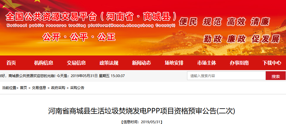 中國(guó)環(huán)聯(lián)網(wǎng)獲悉,5月31日,河南省商城縣生活垃圾焚燒發(fā)電PPP項(xiàng)目發(fā)布資格預(yù)審公告(二次)。項(xiàng)目概況及采購內(nèi)容項(xiàng)目名稱:河南省商城縣生活垃圾焚燒發(fā)電PPP項(xiàng)目;采購編號(hào):商財(cái)采招字(2018)-147號(hào);采購方式:公開招標(biāo) ;建設(shè)內(nèi)容:建設(shè)一座生活垃圾焚燒發(fā)電,一期工程規(guī)模600噸/日,配套一期工程...