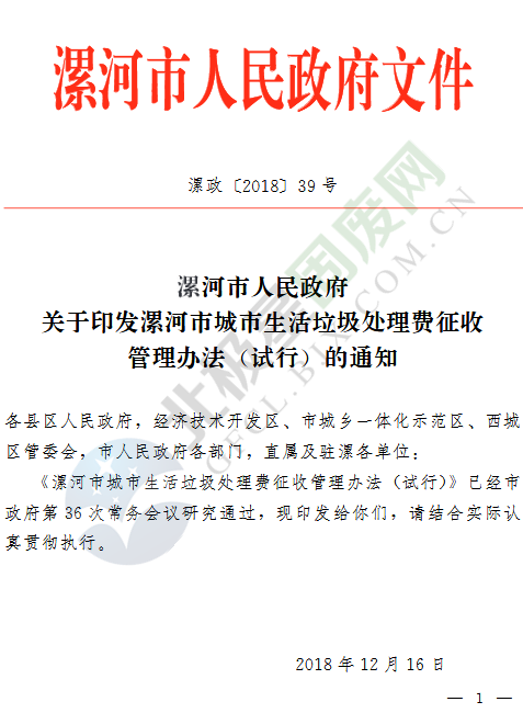 日前,《漯河市城市生活垃圾處理費(fèi)征收管理辦法(試行)》已經(jīng)河南漯河市政府第36次常務(wù)會(huì)議研究通過,并于2019年1月1日起試行。《漯河市城市生活垃圾處理費(fèi)征收管理辦法(試行)》是對《漯河市城市生活垃圾處理費(fèi)計(jì)收管理暫行辦法》(漯政〔2005〕73號)的完善修訂。具體內(nèi)容如下:漯河市城市生活垃圾處理費(fèi)...