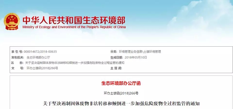 2018年5月10日,生態(tài)環(huán)境部印發(fā)了《關(guān)于堅(jiān)決遏制固體廢物非法轉(zhuǎn)移和傾倒 進(jìn)一步加強(qiáng)危險(xiǎn)廢物全過程監(jiān)管的通知》(環(huán)辦土壤函〔2018〕266號,以下簡稱《通知》)。來源:生態(tài)環(huán)境部《通知》主要要求《通知》要求,各級生態(tài)環(huán)境部門要以習(xí)近平新時(shí)代中國特色社會(huì)主義思想為指導(dǎo),全面貫徹落實(shí)黨的十九大精神,...