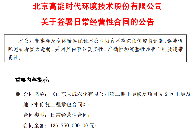 中國水網(wǎng)獲悉,5月22日,北京高能時代環(huán)境技術(shù)股份有限公司(以下簡稱“高能環(huán)境”或“公司”)發(fā)布公告稱,公司于近日簽署《山東大成農(nóng)化有限公司第二期土壤修復(fù)項(xiàng)目 A-2 區(qū)土壤及地下水修復(fù)工程承包合同》,合同金額月1.37億。據(jù)悉,工程內(nèi)容包括編制完整的修復(fù)工程施工方案,經(jīng)專家評審后,報淄博市環(huán)保局備...