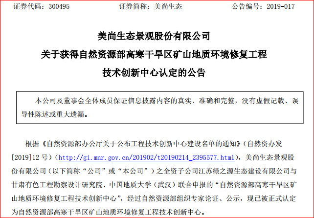 2019年2月18日,美尚生態(tài)景觀股份有限公司(簡稱“美尚生態(tài)”)發(fā)布公告,公司全資子公司江蘇綠之源生態(tài)建設有限公司與甘肅有色工程勘察設計研究院、中國地質大學(武漢)聯(lián)合申報的“自然資源部高寒干旱區(qū)礦山地質環(huán)境修復工程技術創(chuàng)新中心”,經(jīng)過自然資源部組織...