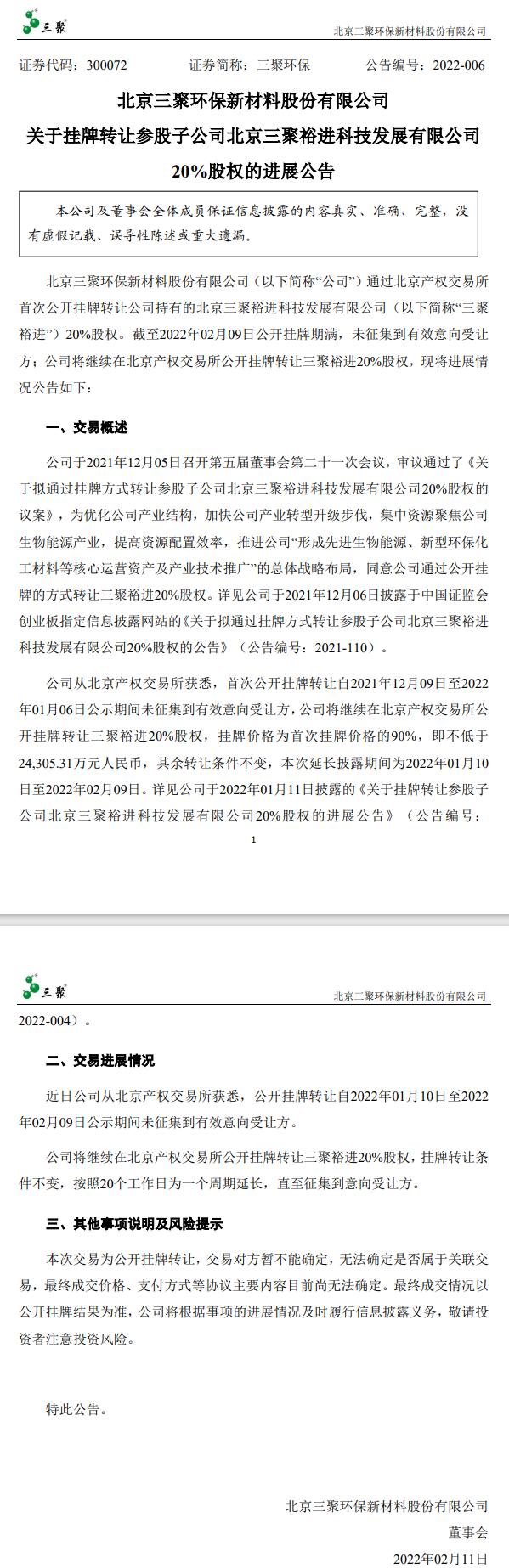 2022年2月11日,北京三聚環(huán)保新材料股份有限公司發(fā)布《關于掛牌轉(zhuǎn)讓參股子公司北京三聚裕進科技發(fā)展有限公司20%股權的進展公告》。 公告顯示,自2021年12月09日,截至2022年02月09日公開掛牌期滿,參股子公司北京三聚裕進科技發(fā)展有限公司20%股權在北京產(chǎn)權交易所公開掛牌未征集到有效意向受...