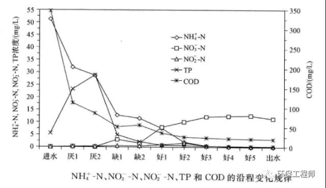 本文通過一張AAO系統(tǒng)內污染物的變化曲線針對每個段的的水質情況進行數(shù)據(jù)進行分析,了解完這個就可以快速知道自己系統(tǒng)的問題,其中,各個單元均是取樣沉淀后,測定的上清液濃度。 1、AAO系統(tǒng)全流程的COD變化 從曲線中看出:進水COD350mg/l左右,厭氧1段:100mg/l左右,厭氧2段:75左右,缺...