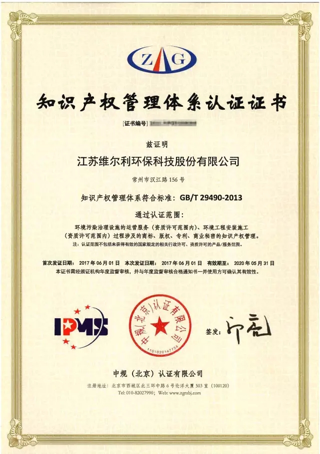 2017年6月,江蘇維爾利環(huán)??萍脊煞萦邢薰卷樌ㄟ^認(rèn)證,獲得GB/T29490-2013知識(shí)產(chǎn)權(quán)管理體系認(rèn)證證書。知識(shí)產(chǎn)權(quán)管理體系是國家知識(shí)產(chǎn)權(quán)局牽頭制定的一項(xiàng)國家標(biāo)準(zhǔn),旨在幫助企業(yè)建立科學(xué)、標(biāo)準(zhǔn)化的知識(shí)產(chǎn)權(quán)管理制度,形成貫穿生產(chǎn)經(jīng)營各環(huán)節(jié)的知識(shí)產(chǎn)權(quán)管理體系,實(shí)現(xiàn)對(duì)知識(shí)產(chǎn)權(quán)的獲取、維護(hù)、運(yùn)用和保...