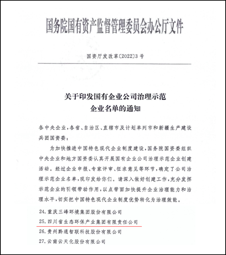 國企改革顯成效 公司治理見真章 四川生態(tài)環(huán)保集團獲評國務院國資委“國有企業(yè)公司治理示范企業(yè)” 近日,國務院國資委正式發(fā)布“國有企業(yè)公司治理示范企業(yè)”名單,四川省生態(tài)環(huán)保產業(yè)集團有限責任公司(以下簡稱“四川生態(tài)環(huán)保集團”)成功入選...