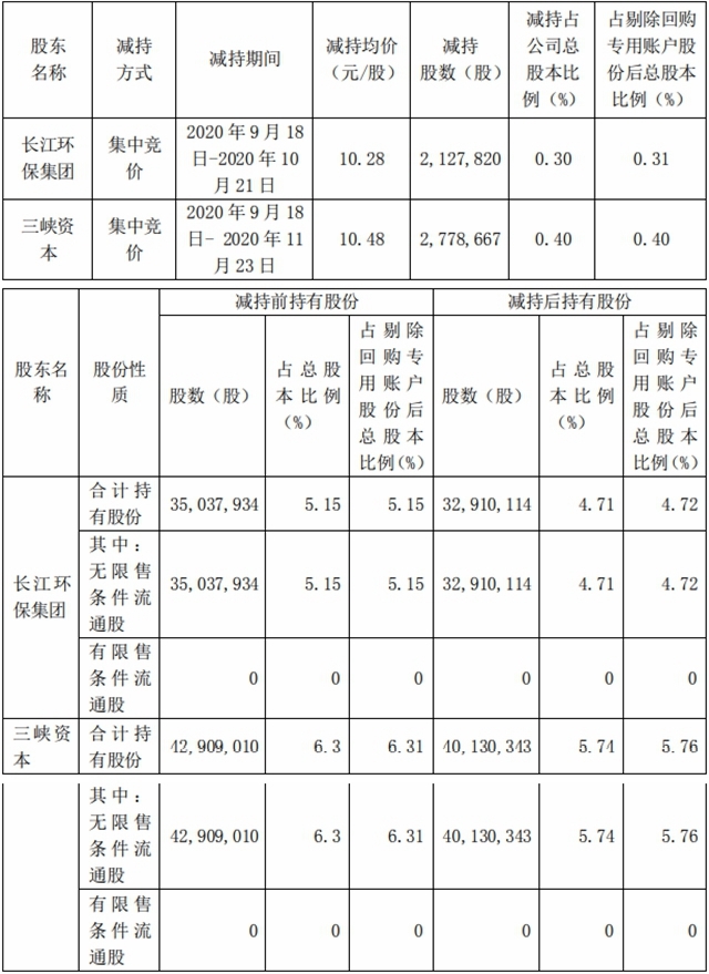 2021年3月19日,中節(jié)能國禎環(huán)保科技股份有限公司發(fā)布《關(guān)于持股 5%以上股東股份減持計劃期滿暨實施結(jié)果的公告》。 即長江生態(tài)環(huán)保集團有限公司與其一致行動人三峽資本控股有限責任公司計劃在6個月內(nèi)以集中競價交易、大宗交易或換購交易型開放式指數(shù)證券投資基金(ETF)方式減持不超過33,975,437股...